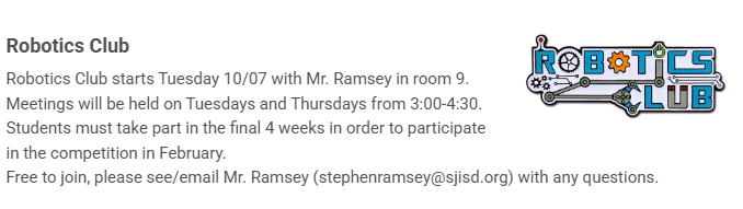 MS Robotics Club will start on Tuesday 10/07. Meetings will be held Tuesdays and Thursdays from 3:00-4:30pm with Mr. Ramsey in room 9. Students must take part in the final 4 weeks of order to particpate in the competition in February.